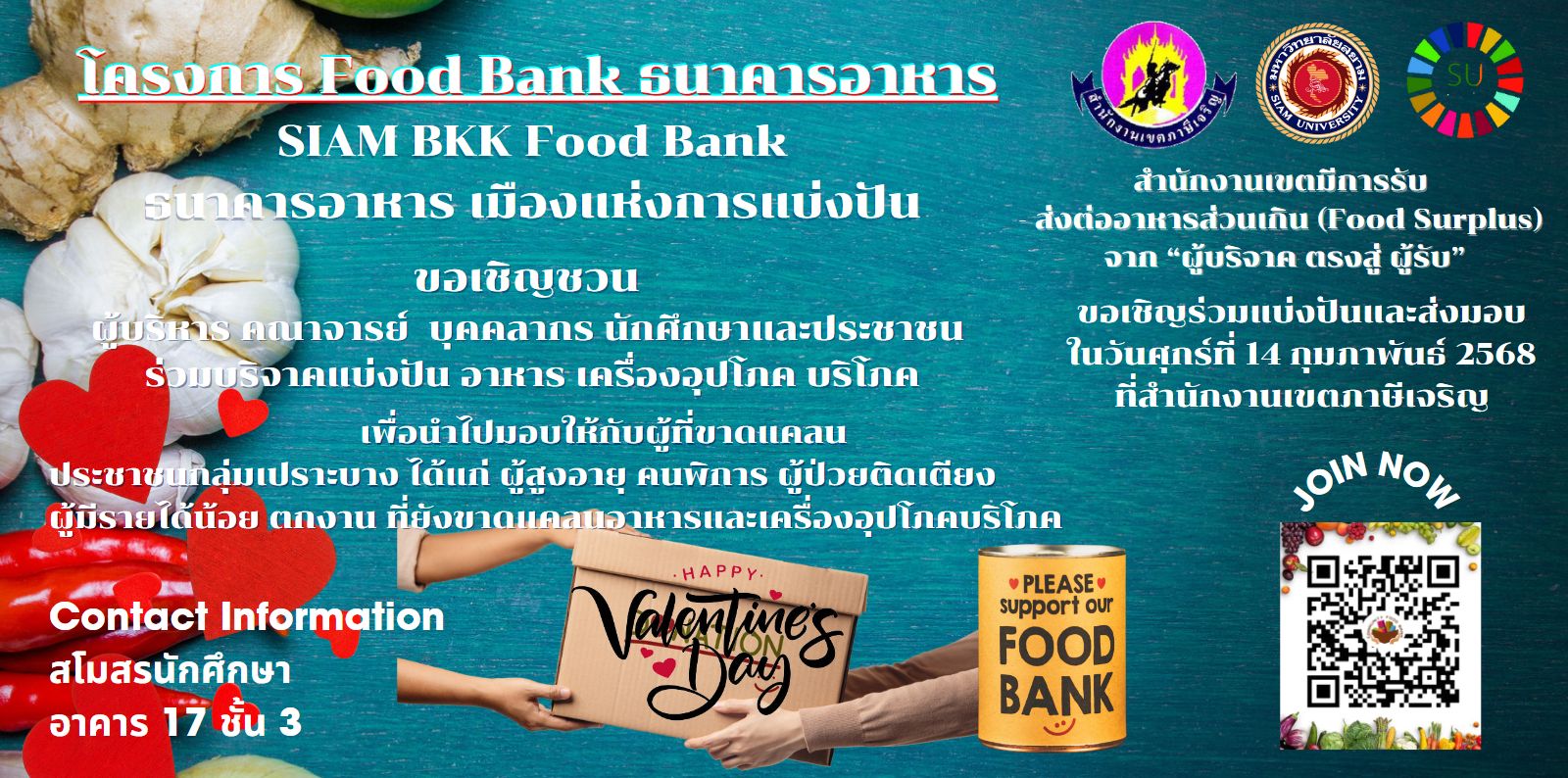 วันที่ 14 กุมภาพันธ์ 2568 มหาวิทยาลัยสยาม เข้าร่วมกิจกรรม BKK Food Bank ส่งต่ออาหารให้กลุ่มเปราะบางอย่างเป็นรูปธรรม โดยสำนักงานเขตภาษีเจริญ ซึ่งมีวัตถุประสงค์เพื่อแก้ไขปัญหาอาหารเหลือทิ้ง(Food wast) ที่ทำให้เกิดความเสียหายทั้งด้านสิ่งแวดล้อมและเศรษฐกิจ สนับสนุนสำนักงานเขตในการจัดหารวบรวมส่งต่อวัตถุดิบอาหารส่วนเกิน (Food surplus) เครื่องอุปโภค บริโภค สิ่งของจำเป็นในการดำรงชีวิต“ผู้บริจาค สู่ ผู้รับ”
